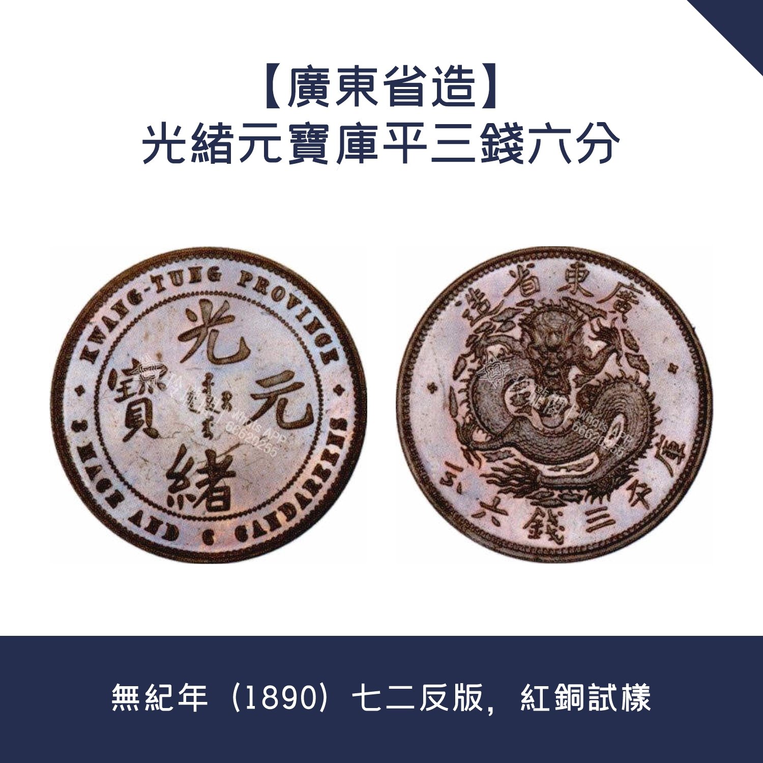在綫鑒定【廣東省造】光緒元寶庫平三錢六分 · 無紀年(1890)七二反版,紅銅試樣