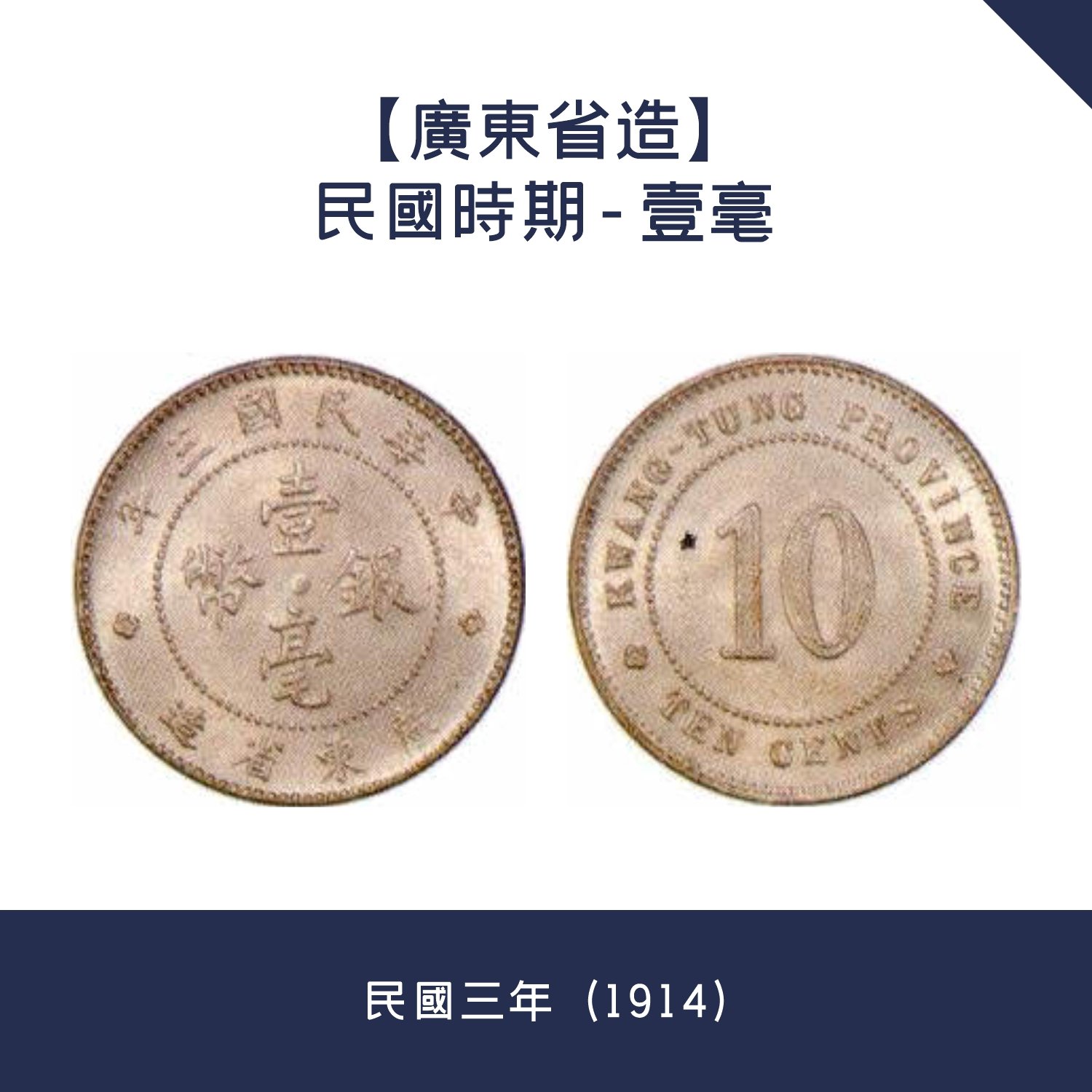 民國三年(1914年),北洋政府頒布《國幣條例》,確立「銀本位」體系,主幣為「袁大頭」壹圓銀幣,輔幣包括伍角、貳角、壹角銀幣。廣東省作為地方鑄幣中心,根據條例鑄行壹毫銀幣(1角),同全國幣制形成呼應,但仍然保留地方設計特色。