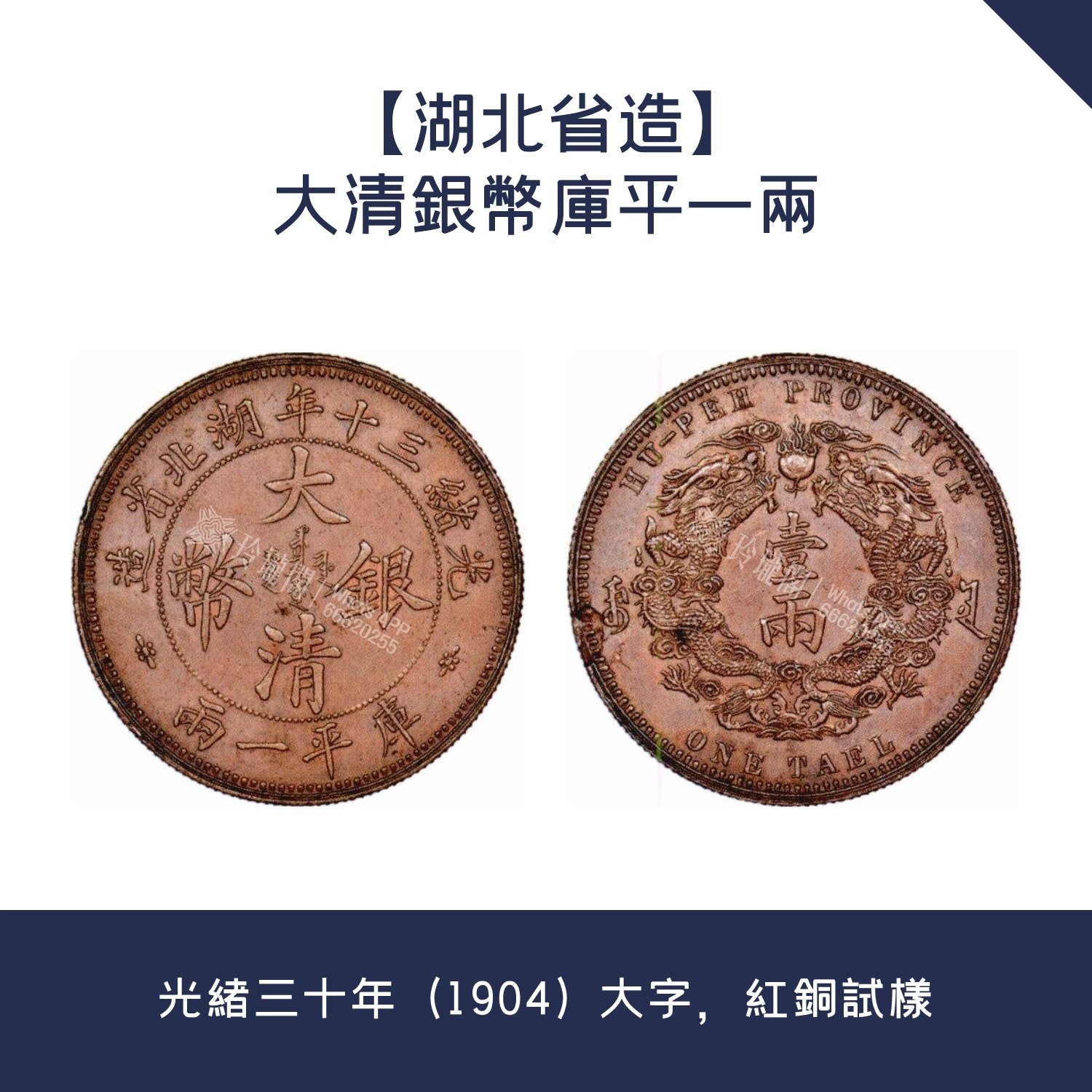版別特點:作為大字版,其正面中央銘文 “ 大清銀幣 ” 四字較大,同小字版形成明顯區別。喺圖案設計上,正面上緣為 “ 光緒三十年湖北省造 ” ,下方刻 “ 庫平一兩 ” ;背面係雙龍戲珠圖案,中央面值 “ 壹兩 ” ,外緣上下為英文。紅銅材質令到佢喺外觀上呈現出獨特嘅色澤,同常見嘅銀幣材質有所唔同。