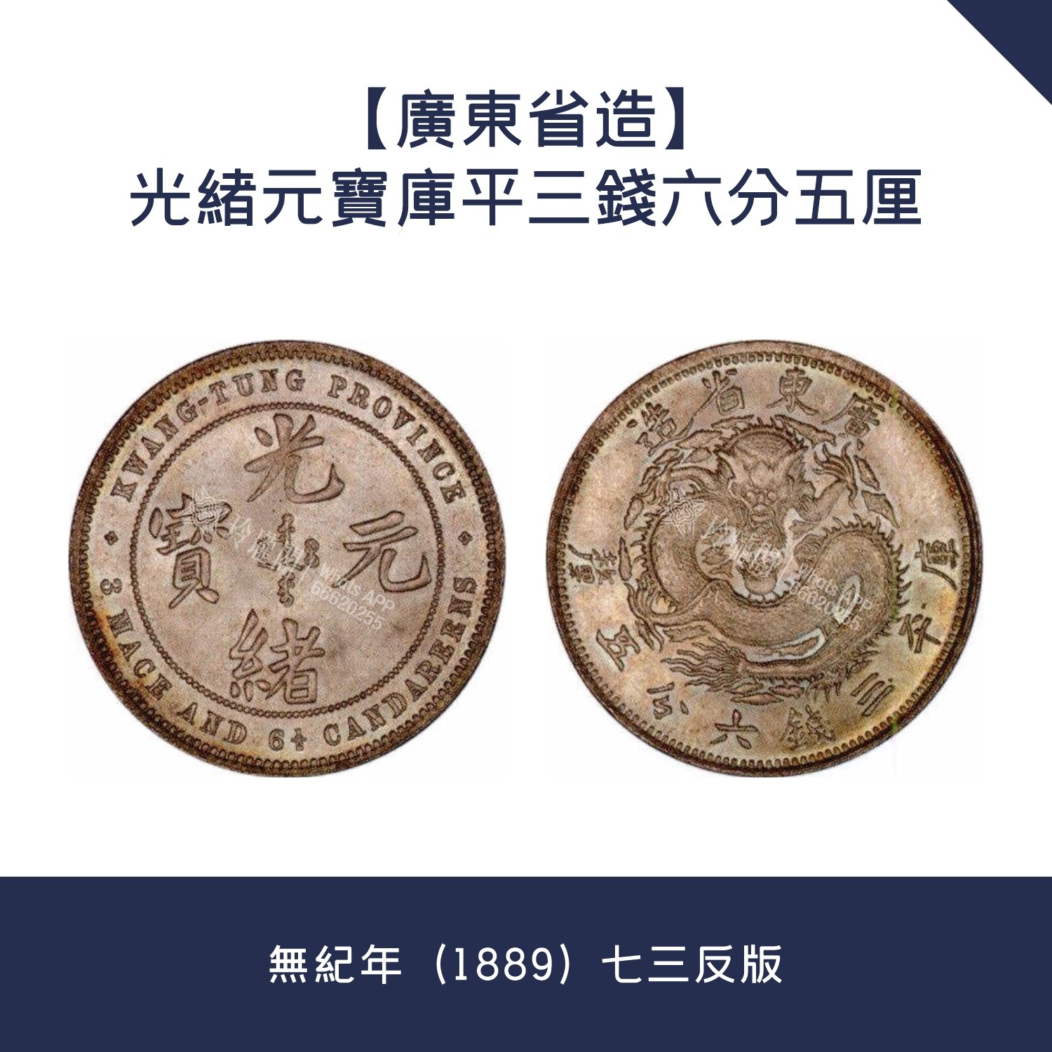 特點:該銀幣又稱 “ 廣東七三反版 ” ,係中國近代機制銀幣嘅開山之作。由英國著名雕刻師艾倫 · 韋恩( Allan Wyon )雕模,英國伯明翰喜敦造幣廠製模,廣東錢局鑄造。因幣值定為庫平七錢三分,比市面流通嘅墨西哥鷹洋重一分,而且將英文置於幣面,同後來全國發行嘅龍洋制式相反,故稱為 “ 七三反版 ” 。其正面中間鈐漢滿文 “ 光緒元寶 ” ,外圍印英文地名及面值,兩側分鈐十字花星;背面中央鈐蟠龍圖,外圍上下鈐漢文地名及面值。