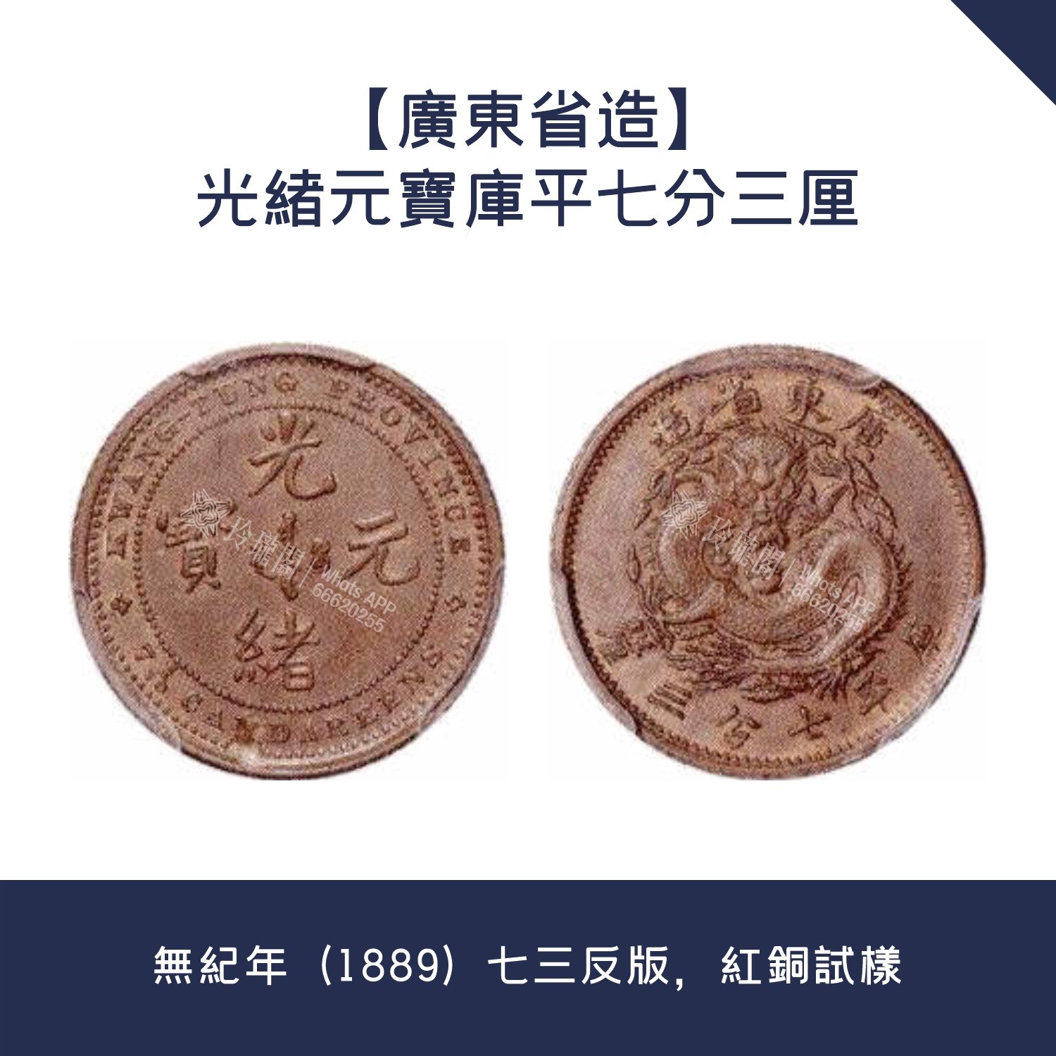 全港回收【廣東省造】光緒元寶庫平七分三厘 · 無紀年(1889)七三反版,紅銅試樣