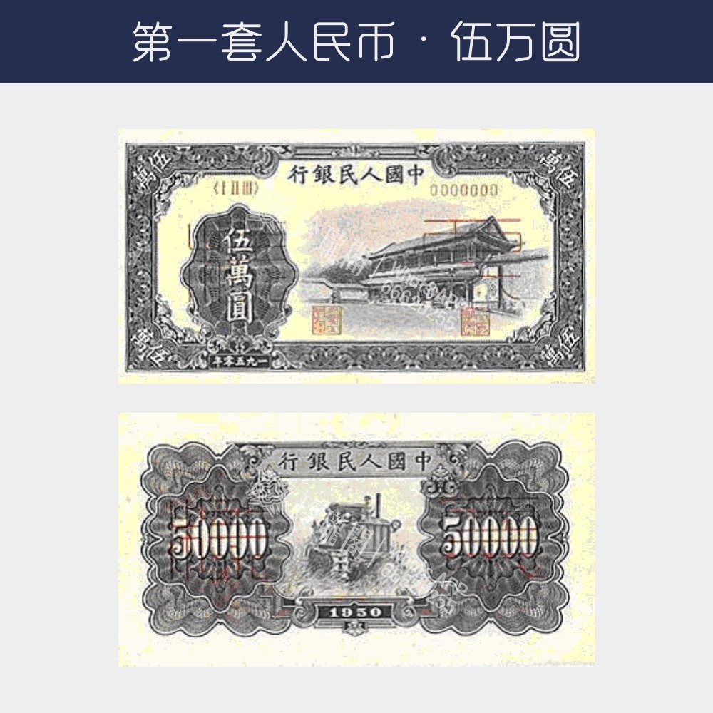 規格為:140 × 75毫米;正面為北京新華門圖,藍黑、紅綠色調;背面圖案為履帶拖拉機圖,深綠色調。該幣於1953年12月發行,1955年4月1日停用。正面主景新華門,坐落於北京長安街,係中南海嘅南大門。新中國成立後,中南海一直係中共中央同國務院所在地,好多重要嘅歷史性會議都曾經喺呢度召開,毛澤東、周恩來、劉少奇、朱德等老一輩革命家亦曾經喺呢度居住同辦公。選擇新華門作為主景圖,反映咗當時新中國政權初建嘅社會背景,以及黨同國家領導人喺人民心中嘅崇高地位。