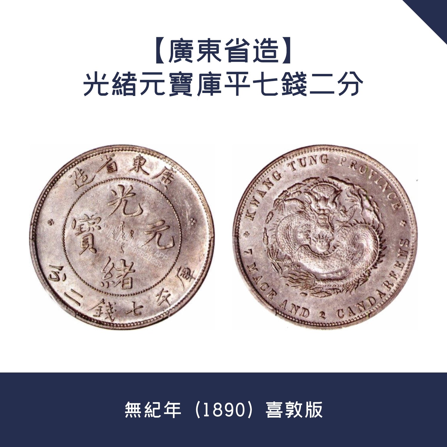 回收【廣東省造】光緒元寶庫平七錢二分 · 無紀年(1890)喜敦版