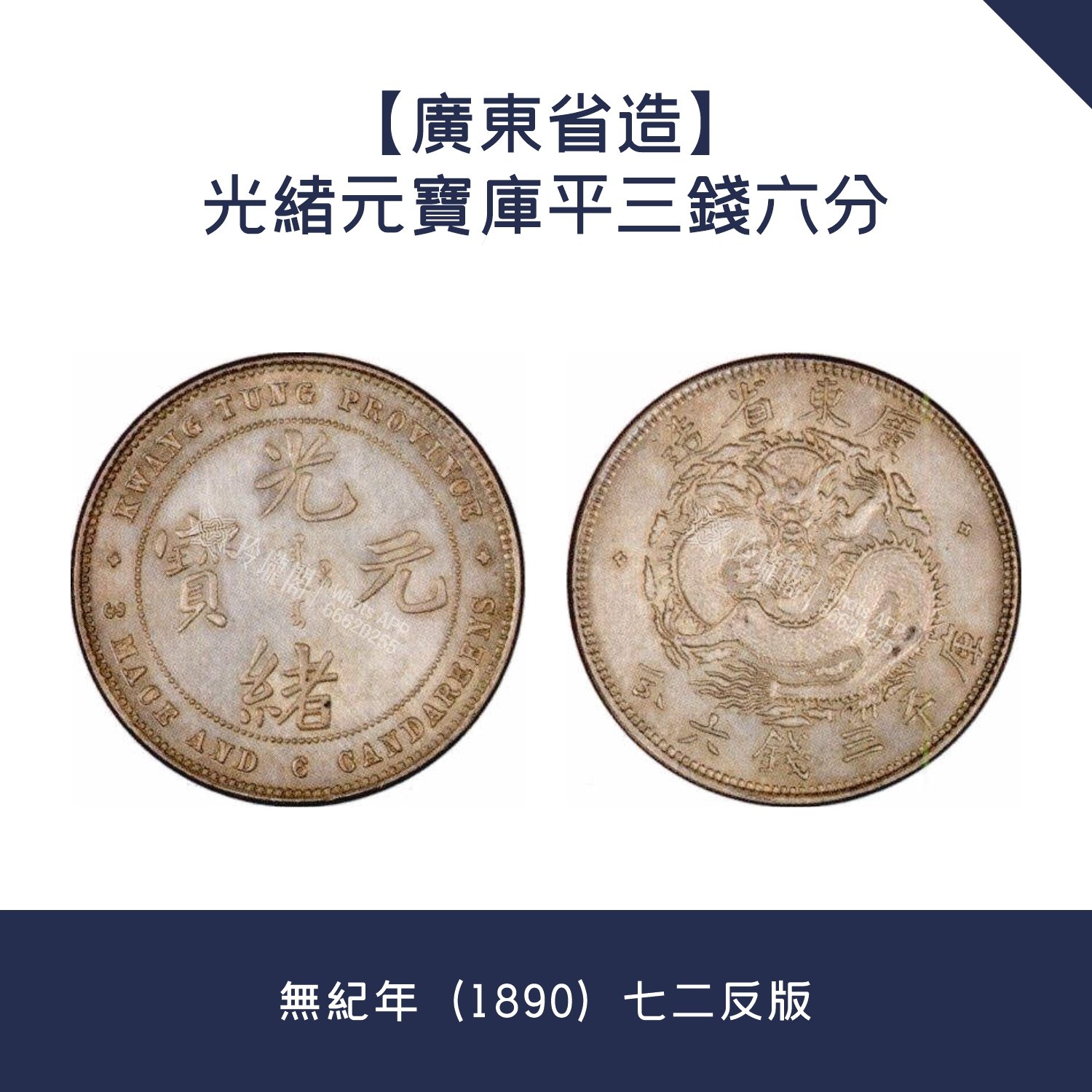 錢幣特徵:正面珠圈內鐫 “ 光緒元寶 ” ,正中為小字滿文,外圈鐫大寫英文,上 “ KWANG – TUNG PROVINCE ” ,下 “ 3. MACE AND 6 CANDAREENS ” ,左右為四點星花;背面為蟠龍圖案,上鐫 “ 廣東省造 ” ,下鐫 “ 庫平三錢六分 . 3,直徑133毫米3。克,直齒邊。該幣文字剛勁挺拔,壓力十足,內齒整飭。