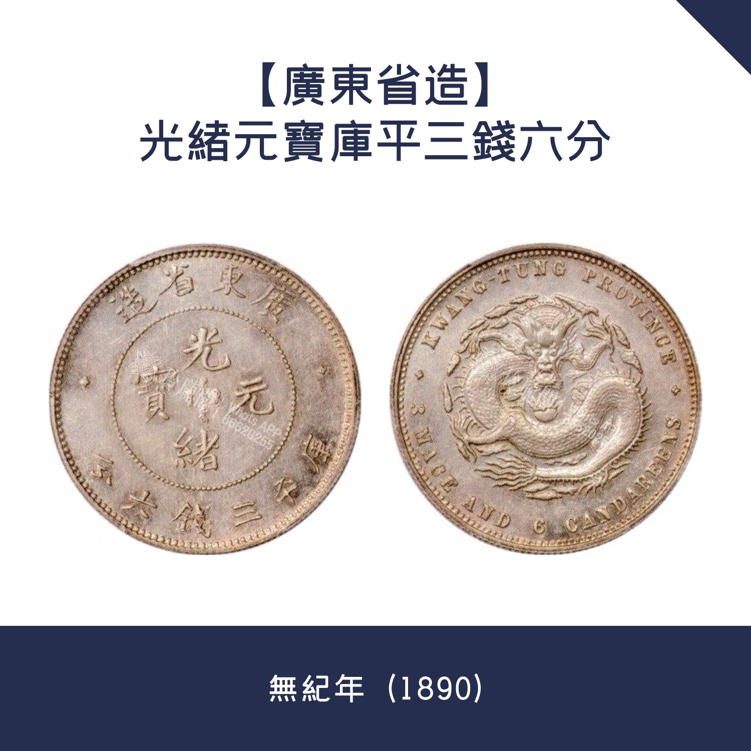 背面特徵:中心為蟠龍圖案,龍紋威武霸氣,龍鱗細膩流暢,盡顯大清王朝嘅權威同尊嚴。上環鑄有英文 “KWANG-TUNG PROVINCE ” (廣東省造),下環鑄有英文 “ 3 MACE AND 6 CANDAREENS ” (三錢六分),同正面嘅文字相呼應。