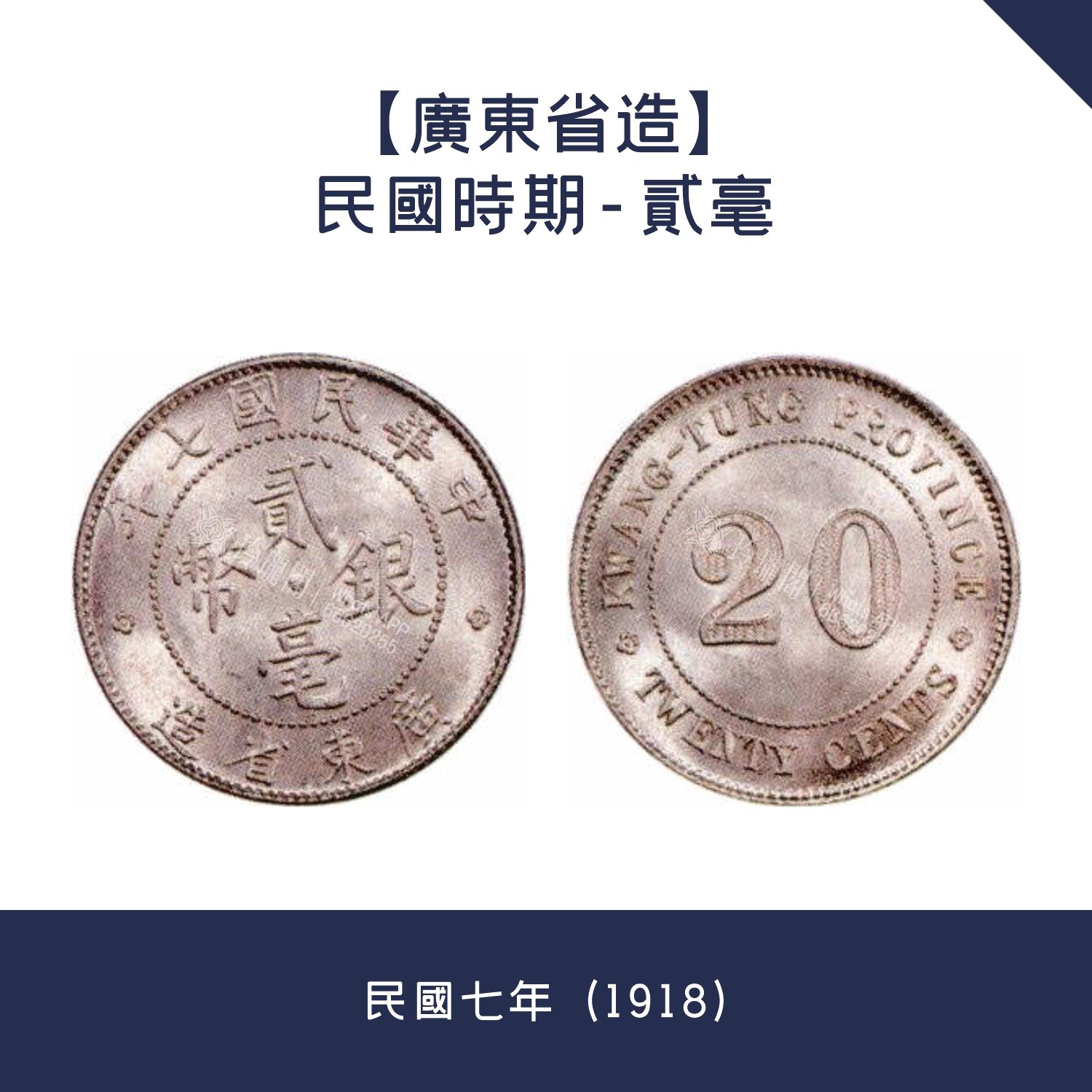 歷史背景:1918年歐戰結束,廣東幣廠旋即恢復鑄造,當時幣廠為西南軍閥唐繼堯、陸榮廷控制。當年元月,龔政接任財政部廣東造幣分廠廠長,息借商款,停鑄銅幣,於六月二十二日正式開鑄民國七年廣東貳毫。