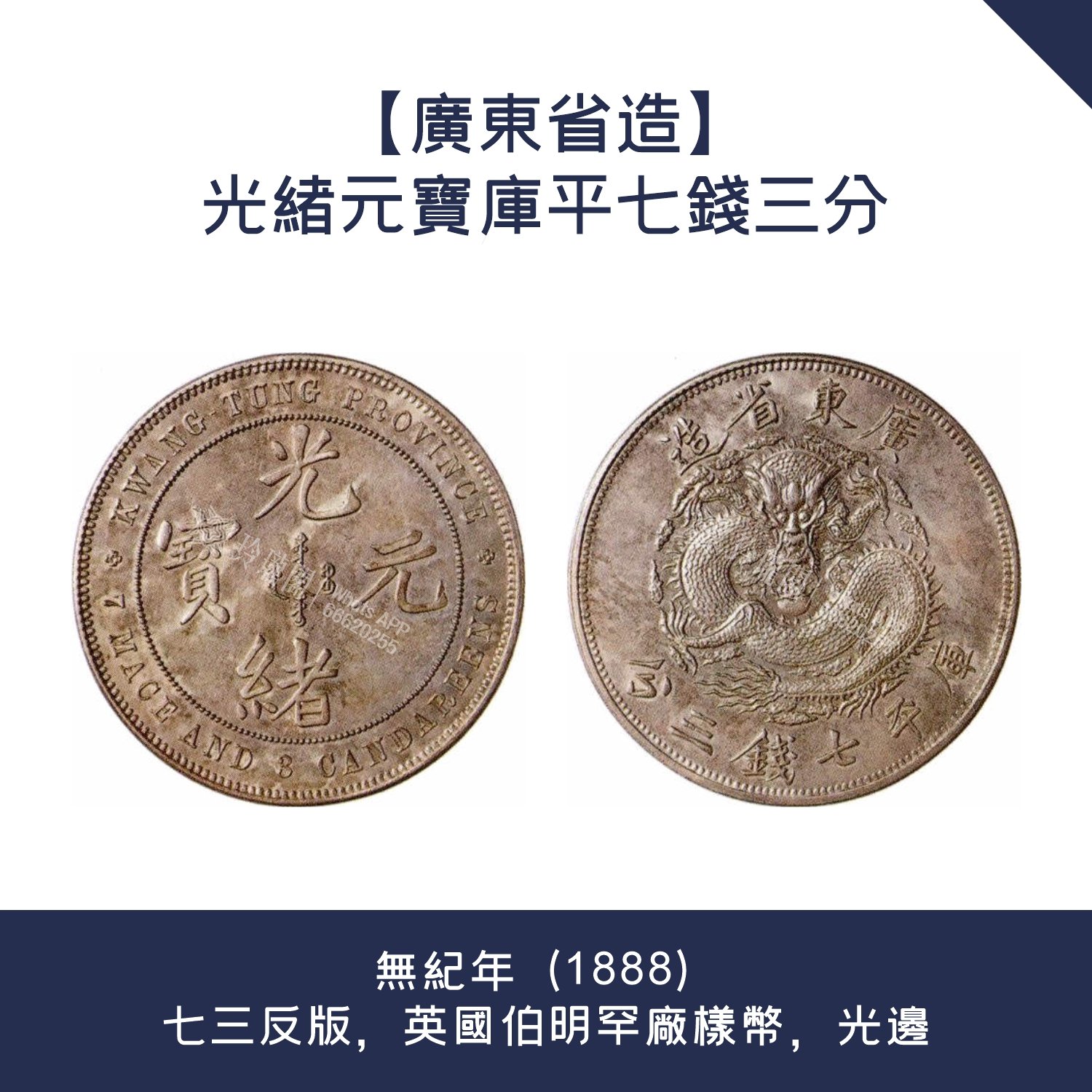 香港錢幣價錢【廣東省造】光緒元寶庫平七錢三分 · 無紀年(1888)七三反版,英國伯明罕廠樣幣,光邊
