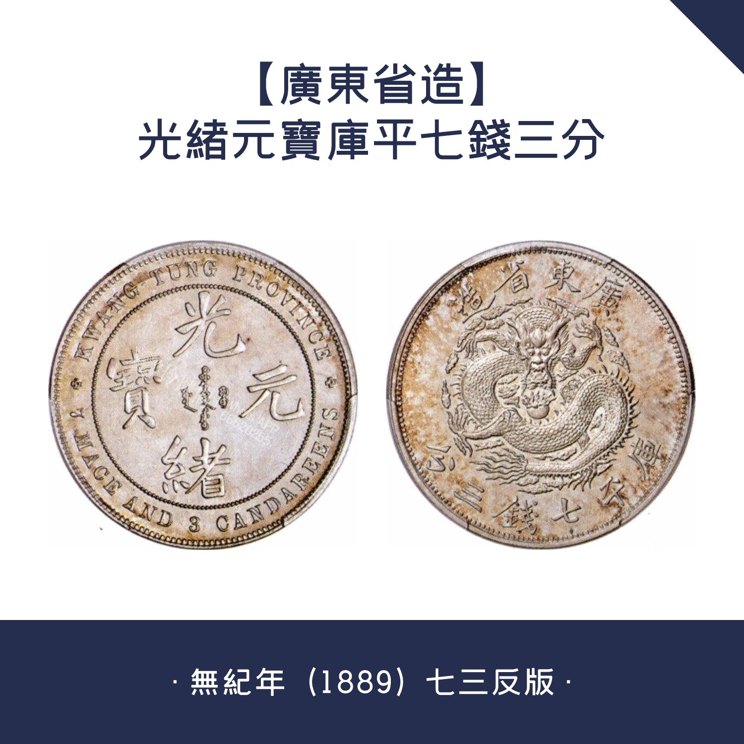 香港錢幣鑒定【廣東省造】光緒元寶庫平七錢三分 · 無紀年(1889)七三反版-行情
